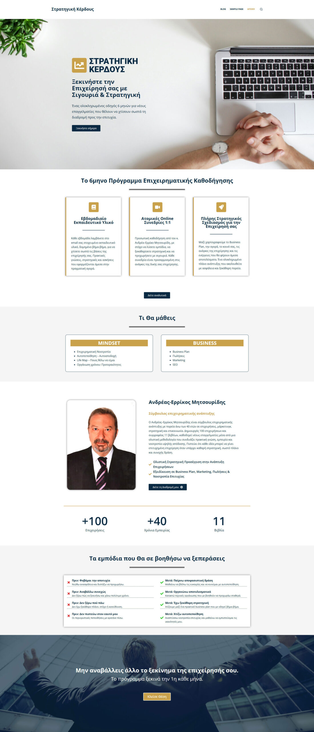 Ο Ανδρέας Ερρίκος Μητσουρίδης είναι ένας επιχειρηματίας με μια επαγγελματική διαδρομή 50 ετών. Μου εμπιστεύτηκε την κατασκευή μιας ιστοσελίδας, που έχει ως σκοπό να μεταδώσει τις γνώσεις και την εμπειρία του σε νέους επαγγελματίες αλλά και σε ήδη υπάρχοντες, μέσα από ένα πλάνο 6 μηνών που θα τους βοηθήσει να εδραιωθούν σε ένα ανταγωνιστικό περιβάλλον